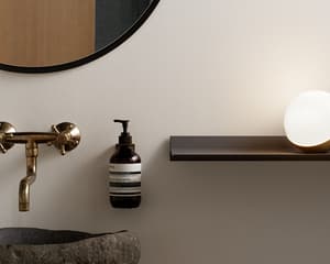 Som nattbordlampe har vi valgt nyheten VL Studio Bord / Gulv sort. En stilig lampe med en varm stemning til soverommet. Den kommer både med en struktur av messing og en i matt sort. VL Studio ble originalt designet av Vilhelm Lauritzen til Radiohuset i Danmark. Navnet "Studio" ble valgt fordi noen av lampene ble brukt utenfor studio for å indikere - med rødt eller grønt lys - om en innspilling var på gang.