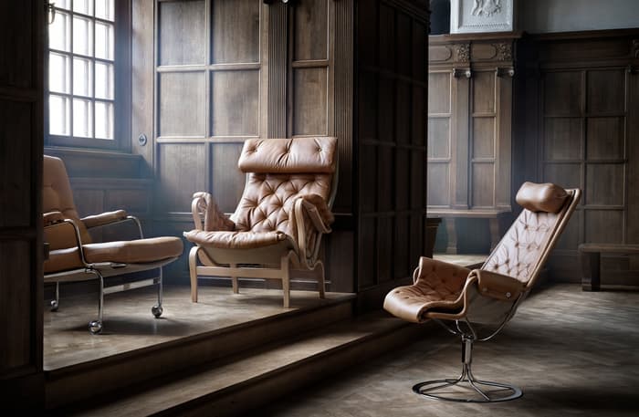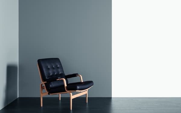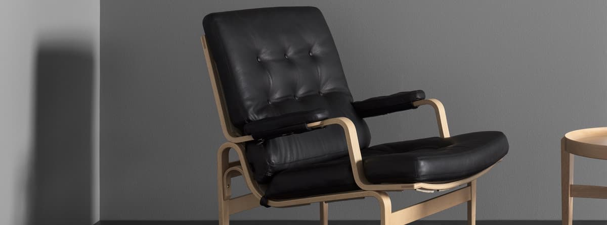 Ikonisk lenestol designet av Bruno Mathsson. Ingrid er Karins søster, men i formpresset bøketre. Ingrid har knapper både på setet og ryggputen.